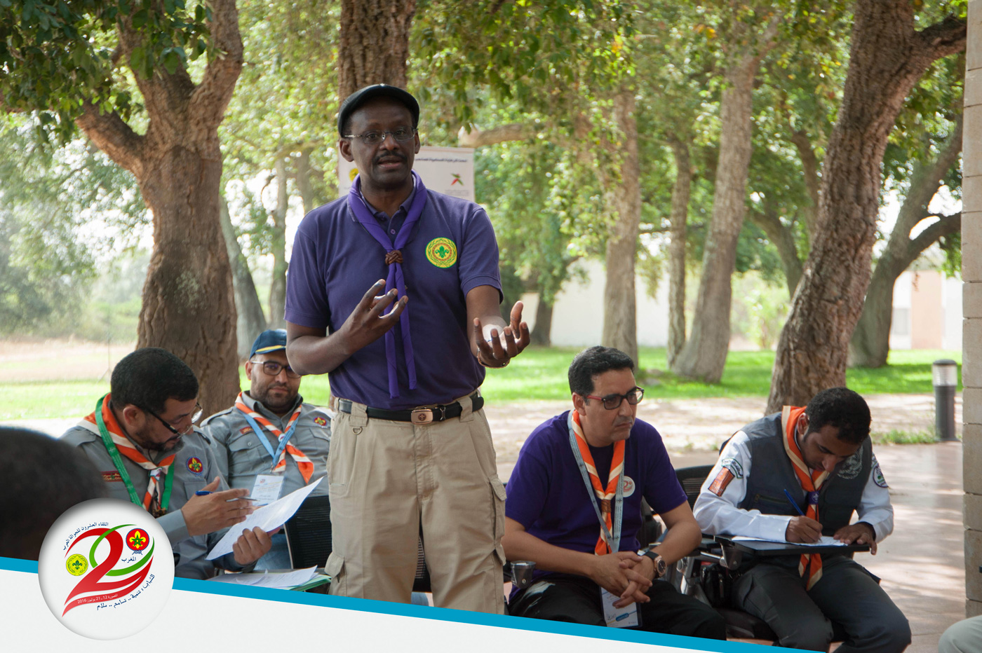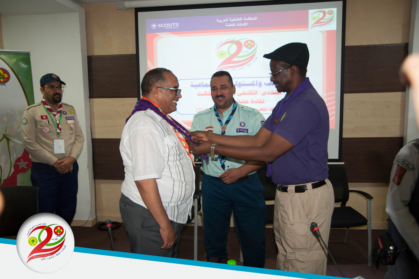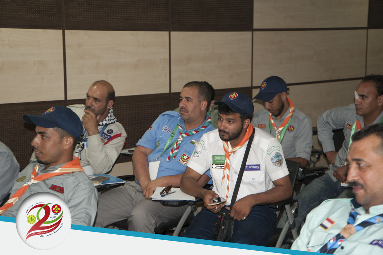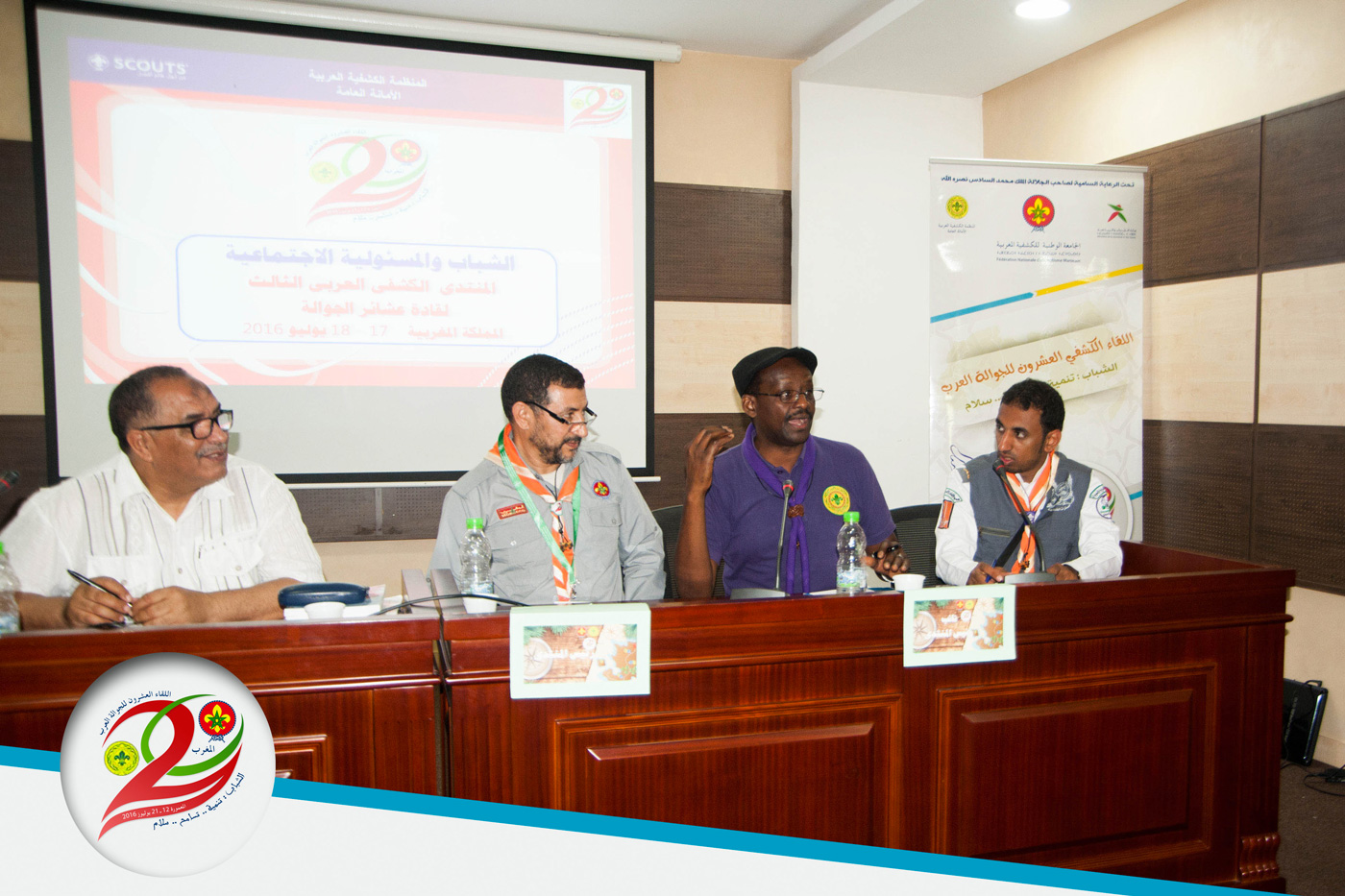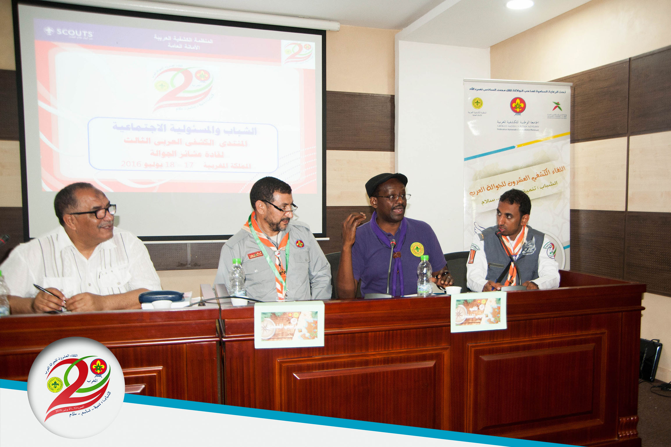 عقد اليوم ومواكبة ايضا للقاء العشرين للجوالة العرب والذى يعقد خلال الفترة من 12-21 يوليو2016 بغابة المعمورة االمملكة المغربية وحول موضوع الشباب والمسئولية الإجتماعية تولى رئاسة المنتدى القائد/خالد العثمانى (المغرب) ونائب الرئيس القائد/وائل على خواجى (السعودية) والمقرر القائد/محمد الهادى بن عبد الرازق (تونس) . وافتتح أعمال المنتدى د عاطف عبد المجيد الأمين العام والمدير الإقليمى والقائد حميد المنيعى قائد اللقاء العشرون للجوالة العرب شارك فى المنتدى :الأردن(1)، تونس(2)،الجزائر(2)،السعودية (3)،السودان(2)،فلسطسين(1)،لبنان(1)،المغرب(8)،مصر(1)،الأمانة العامة (5)،أدارة الجامعة (7). وقدم د عبد الله أبو إياد العلوى الأستاذ فى كلية الحقوق مداخلة هامة معرفا التربية بانها عملية انسانية تستثمر العلوم والمعارف والتقنيات من أجل تمكين الإنسان من مهارات صناعة الحياة وقيادتها . وتناول في مداخلته المحاور التالية :التفكير الواجب والمسئولية الإجتماعية ،التربية على الفكر الواجب ، مفاهيم تعرقل التربية على الفكر الواجب ، الفكر الواجب فى أطار المسئولية الإنسانية ،دور القادة فى التربية على التفكير بالإنسان من خلال عدة نسق: النسق البيوعصبى ،النفسى ،الإجتماعى ،الثقافى ،البيئى،الصعوبات التى تواجه الشباب :المشاركة-الآفات الاإجتماعية –خصومات التعلم _خصومات الإنصات، على القادة التعامل مع الصعوبات بالإعتماد على 3 مبادئ التقبل ،الفردية،السرية .